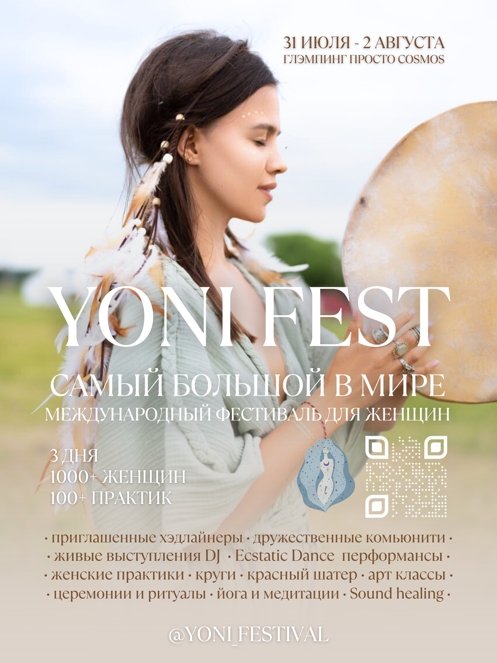Приглашаем вас на YONI FEST — крупнейший в мире международный фестиваль, созданный исключительно для женщин. С 31 июля по 2 августа 2026 года мы соберёмся в пространстве ПРОСТО COSMOS, чтобы вместе прожить три дня глубокой трансформации, вдохновения и подлинного женского единства.